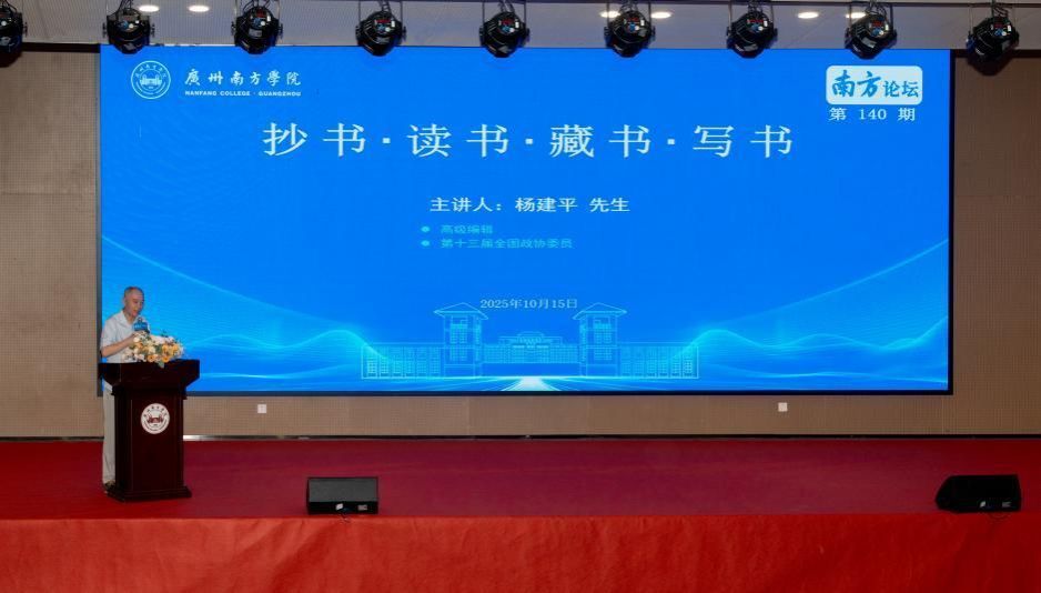2025年10月15日,广州南方学院南方论坛第140期在学校教研楼报告厅成功举办。高级编辑、第十三届全国政协委员杨建平先生受邀担任主讲嘉宾,作题为《抄书·读书·藏书·写书》的讲座。广州南方学院校长汤涛院士、广州南方学院副校长杨双华院士等校领导,学校教学单位、行政单位主要负责人以及教师和学生等400余人参加讲座。讲座由校长顾问、博雅学院院长张明远教授主持。