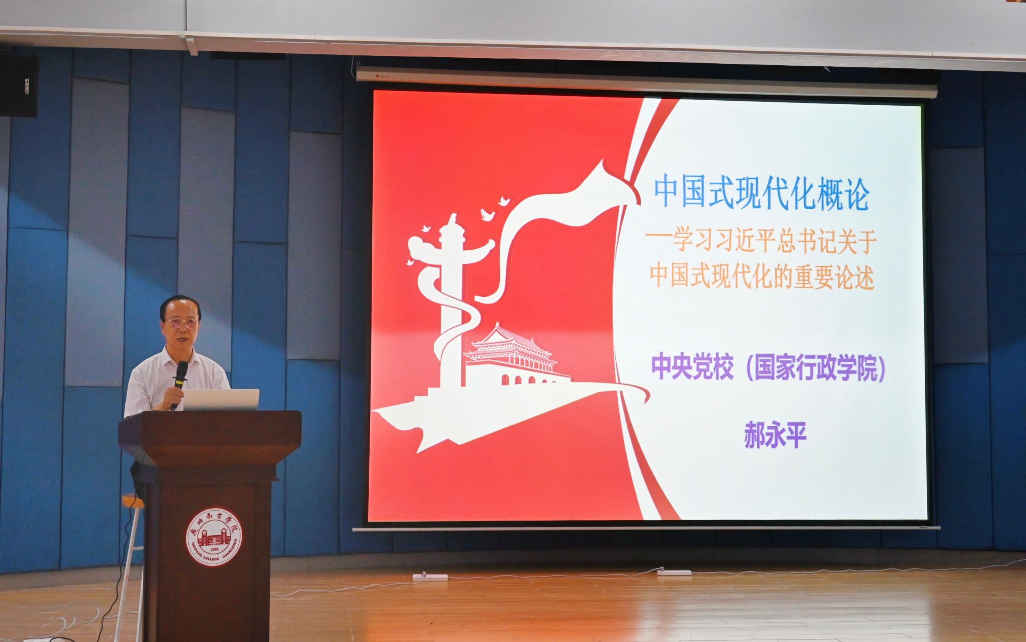 6月18日,广州南方学院南方论坛第139期在1号教学楼105教室成功举办。中央党校(国家行政学院)教授、博士生导师郝永平受邀担任主讲嘉宾,作题为《中国式现代化导读》主题报告。学校党委副书记、副校长植秀聪等校领导,相关教学单位、行政单位主要负责人、教师和学生等200余人参加讲座。讲座由校长顾问、博雅学院院长张明远教授主持。