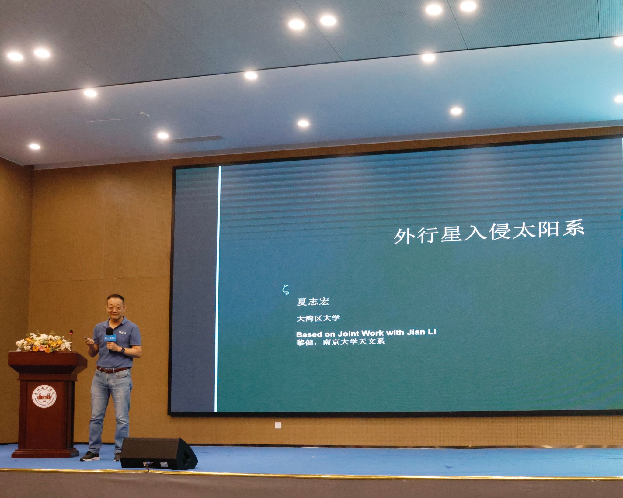 夏志宏教授首先对广州南方学院的诚挚邀请表达衷心的感谢。随后,他向在场师生分享最新研究成果——其带领的研究团队通过精密数学模型与大规模计算模拟,发现了一颗闯入太阳系的外来行星。夏志宏谈到:“这颗外来行星的质量介于土星与木星之间,约为地球的95~318倍,它在大概3亿年前突然造访太阳系,短暂游荡后又离开。”