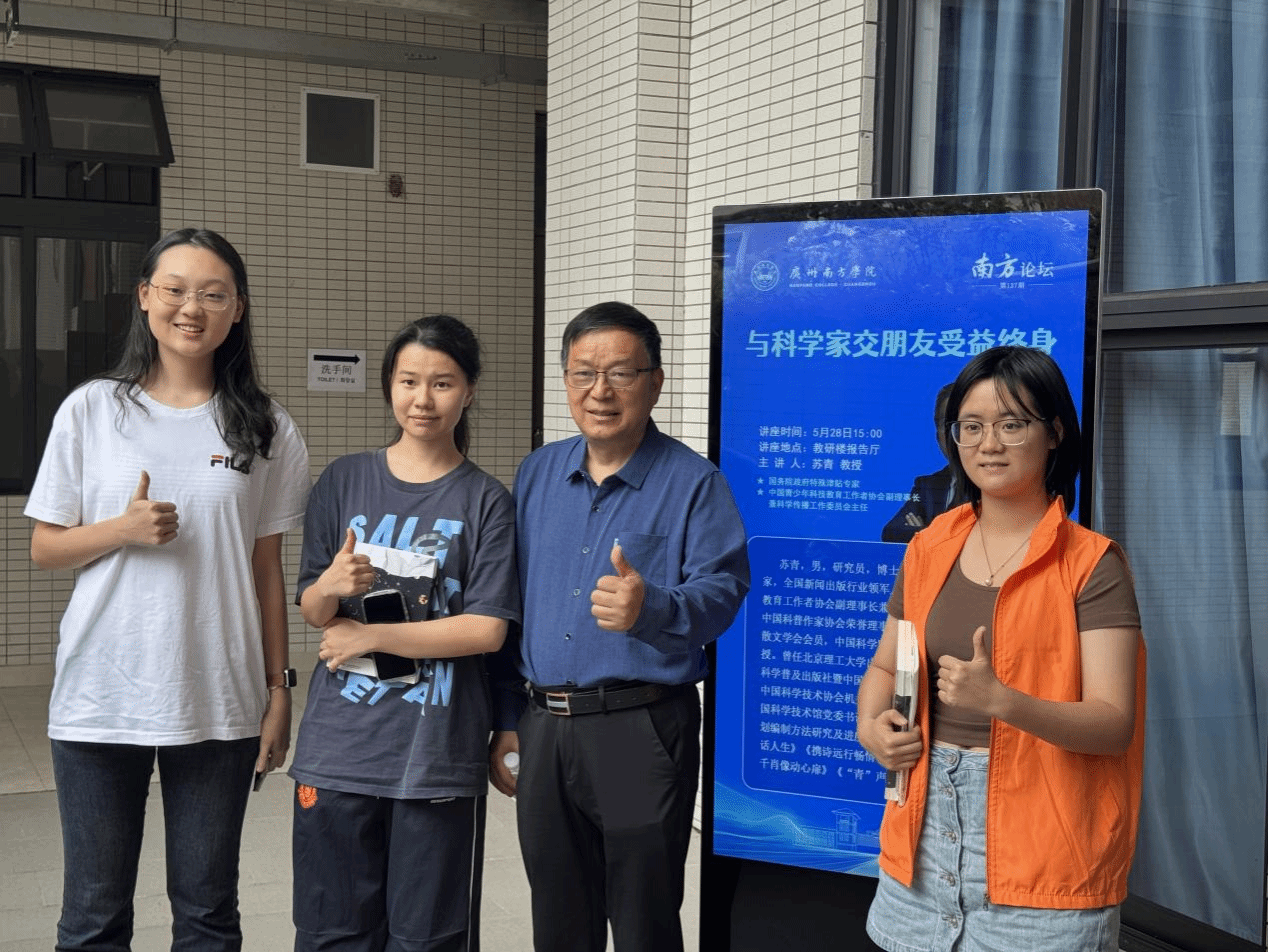 讲座结束后,同学们与苏青教授合影留念。苏青教授不仅热情回应,更将其著作《“青”声说科普》亲笔签名赠予学生。2023级行政管理专业的欧阳雅表示:“通过本次讲座,我对科学家精神有了全新且深刻的认知。苏教授分享陆琰院士、师昌绪院士、王淦昌院士等科学家的事迹,深深地触动了我。这也让我意识到,在今后的学习中要保持独立思考,敢于提出自己的见解,追求真理、脚踏实地,真正做到学有所获、学有所成。”