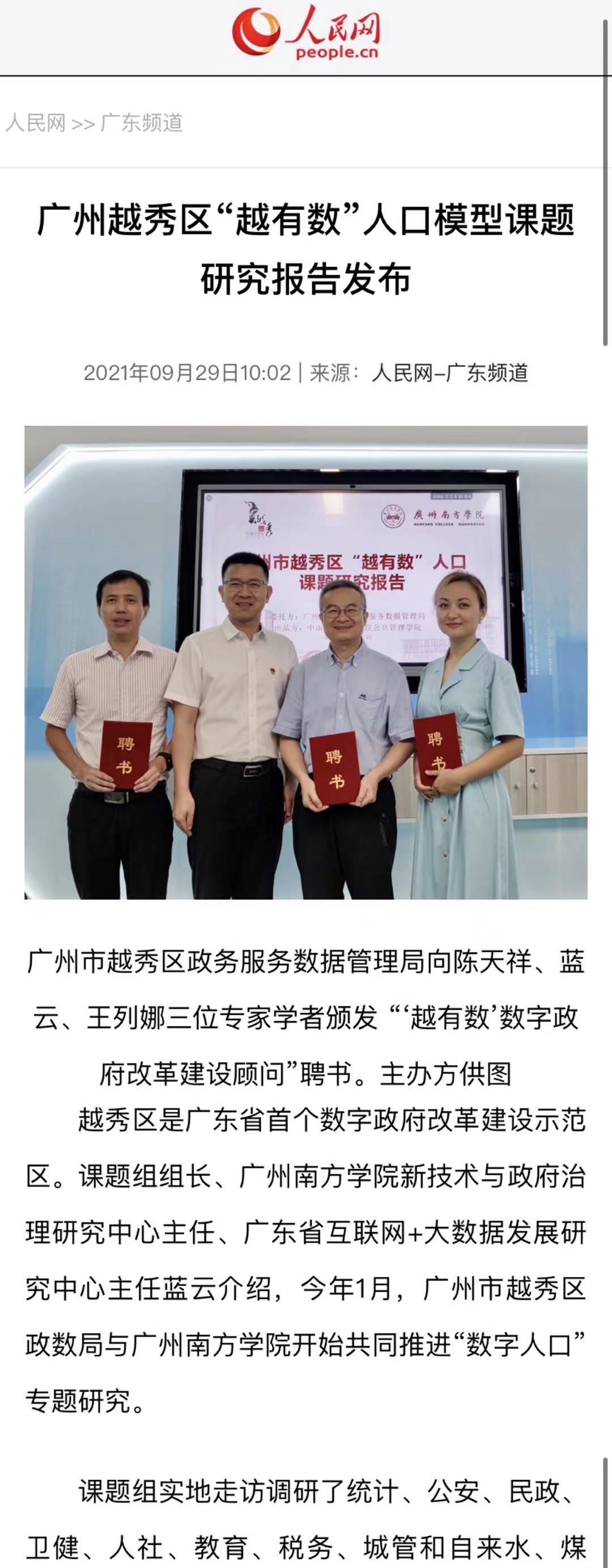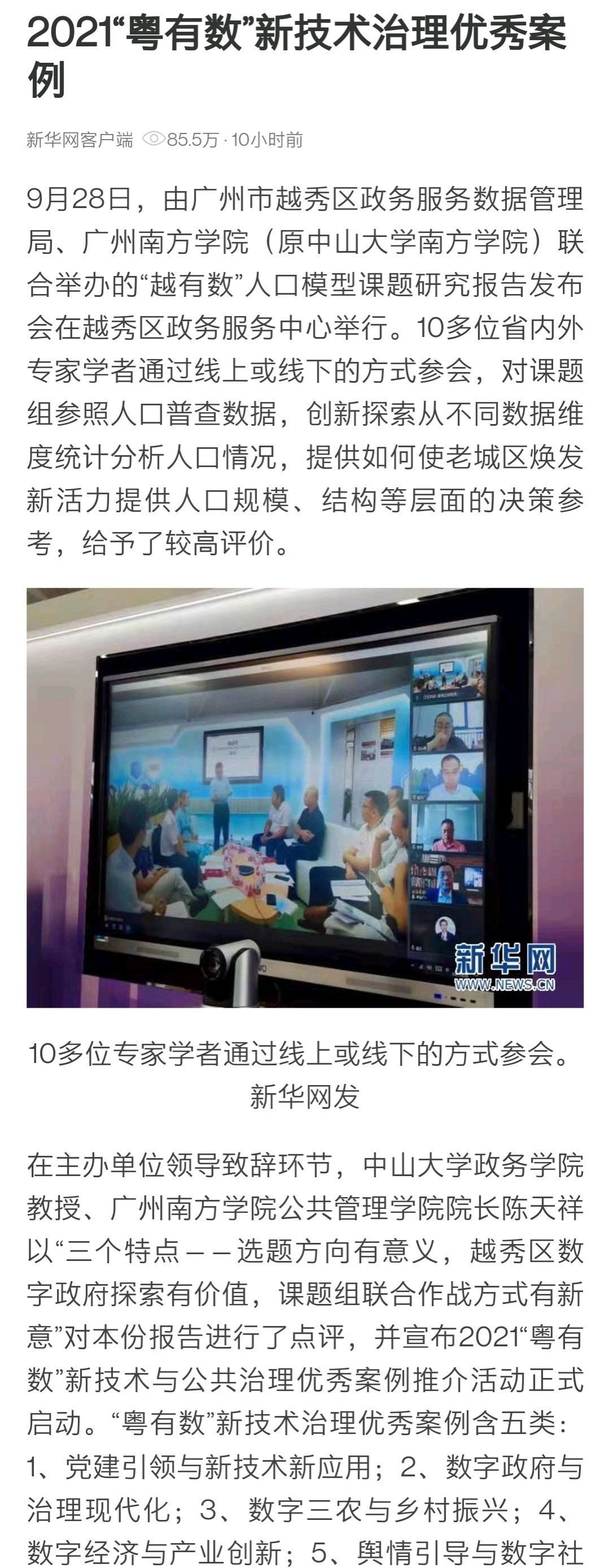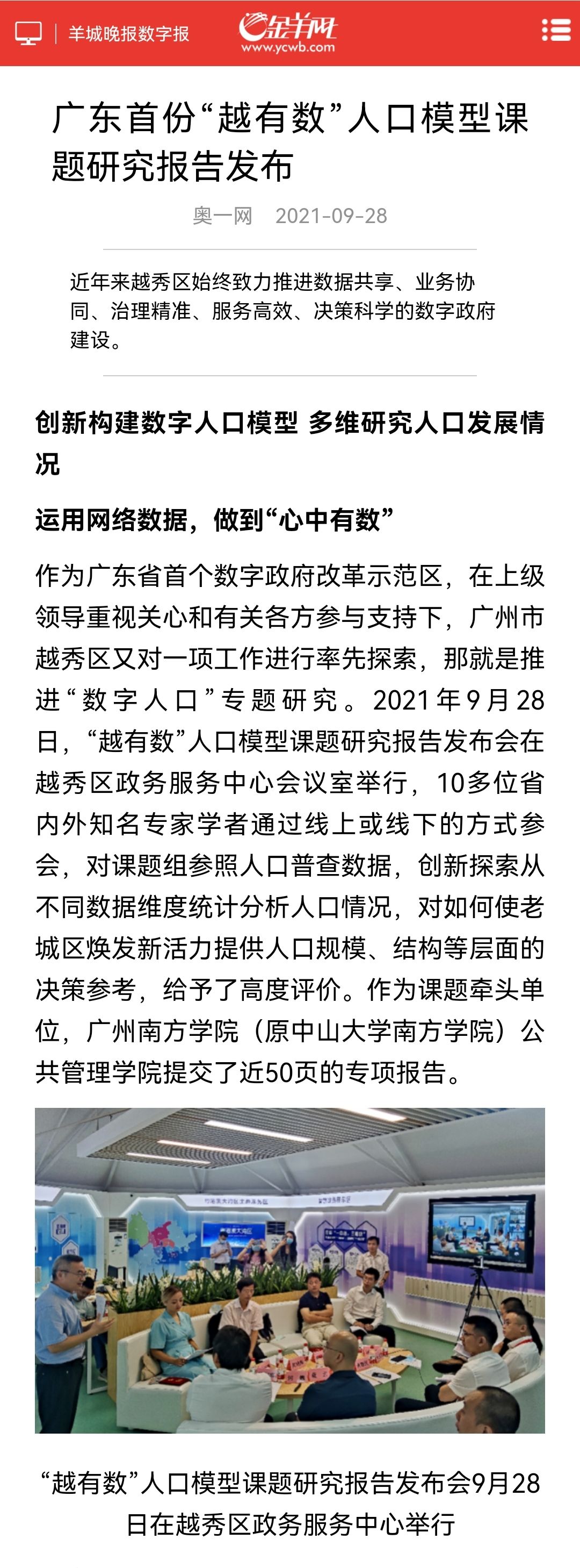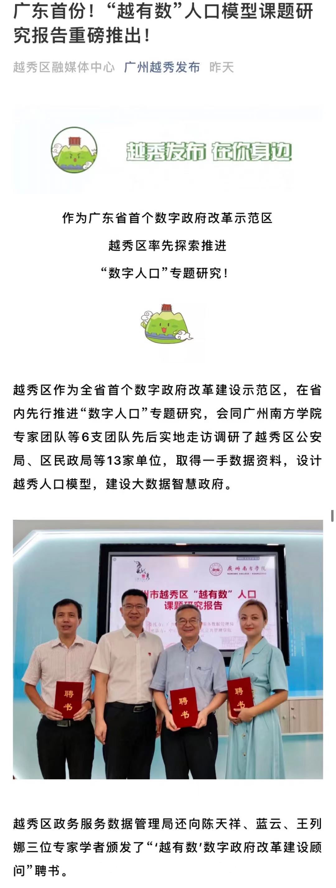 【编者按】近日,由广州南方学院公共管理学院院长陈天祥教授指导、广州南方学院公共管理学院特聘教授兼新技术与政府治理研究中心蓝云主持的广东首份“越有数”人口模型课题研究报告正式发布,获各界广泛好评。省市区政数系统领导和国家信息中心信息化和产业发展部、清华大学社会数据治理研究中心、华南师范大学、工信部电子五所等机构的领导专家对广州南方学院领衔的这个课题给予了充分认可,点赞整篇报告“有高度、有速度、有亮度、有宽度、有精度”。会上,陈天祥院长指出:“越秀区‘越有数’探索经验,本身就是‘粤有数’的有力推介,这也是数字政府造福于民的生动解读及最佳实践”。会上,陈天祥院长还隆重宣布:2021“粤有数”新技术与公共治理优秀案例推介活动正式启动。陈天祥院长和蓝云教授还受聘为“‘越有数’数字政府改革建设顾问”。人民网、新华网和南方报业传媒集团、羊城晚报集团、广州日报集团旗下报刊网站客户端,广州市越秀区官方微信公众号“广州越秀发布”,以及新浪、腾讯、网易、搜狐、中国网等30多家主流媒体机构,对本课题给予了重点报道。以下为相关转载: